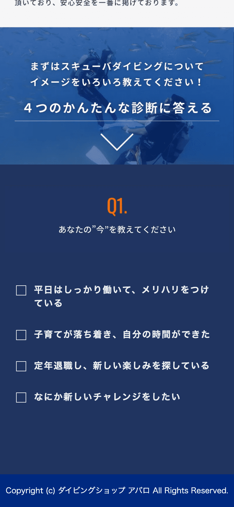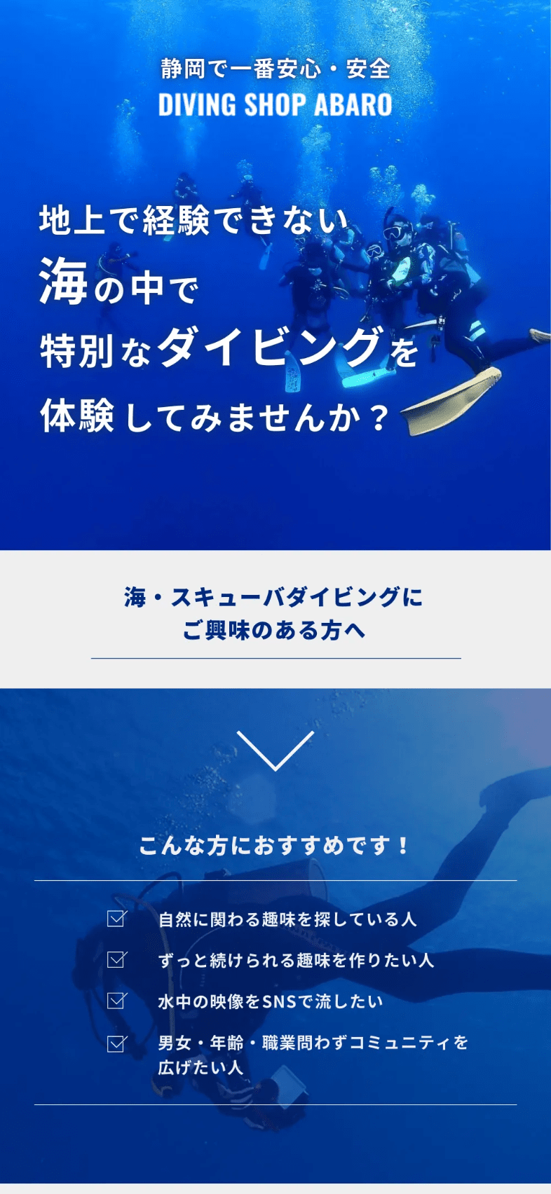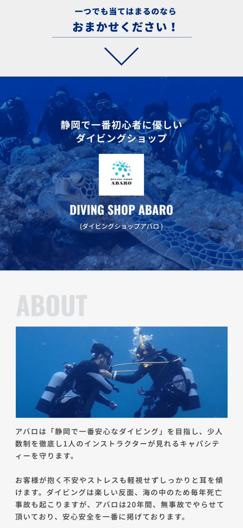 静岡のダイビングショップ、DIVING SHOP ABARO 様のLPとインスタ広告。