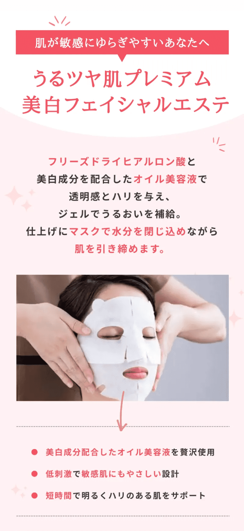 診断型の質問からお悩み別に施術の提案をして来院してもらう流れで、全体的にピンクをベースにポップな素材をあしらいながら、親しみがあって気軽に通えるサロンだと伝わるよう仕上げています。
